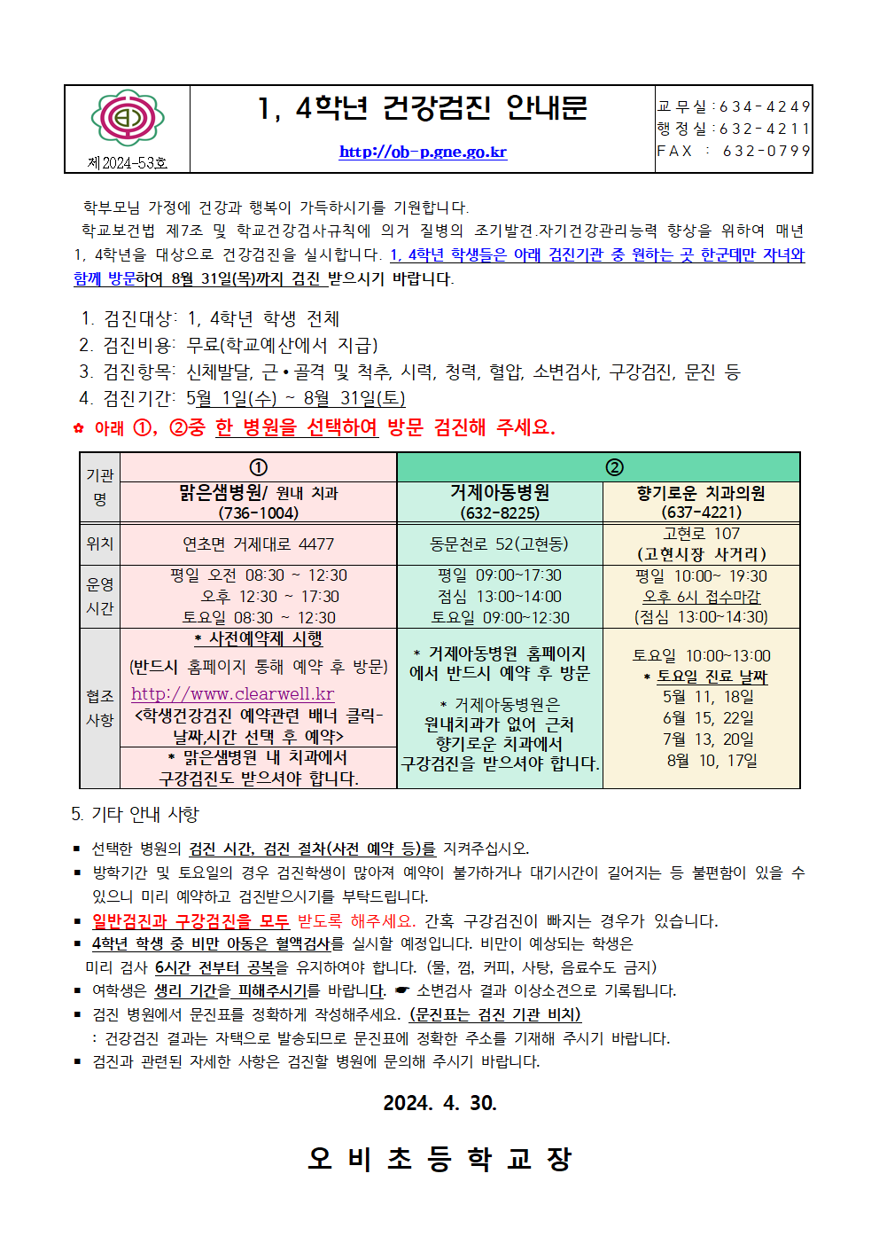 2024. 학생 건강검진 안내(1.4학년)