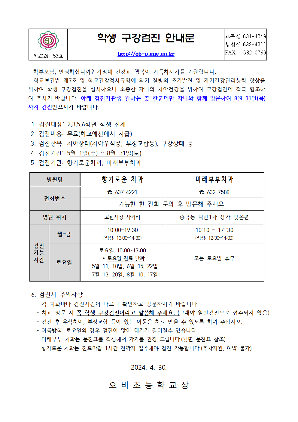 2024. 학생 구강검진 안내문(2.3.5.6학년)