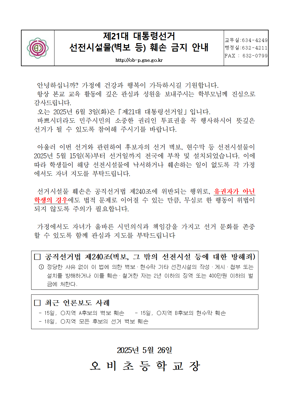 제 21대 대통령선거 선전시설물 훼손 금지 안내