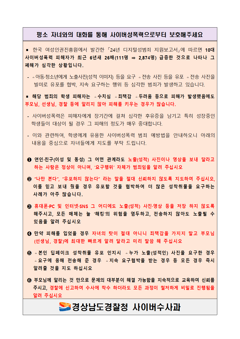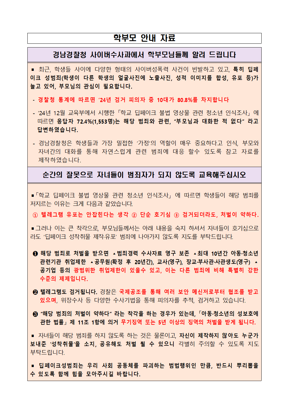 최근 AI 기술이 발전, 청소년들이 손쉽게 딥페이크 기술을 접하면서 딥페이크 성범죄 가해자 중 청소년이 급증하고 있어 이에 대한 예방관련 자료를 거제경찰서에서 보내왔기에 안내드립니다.
