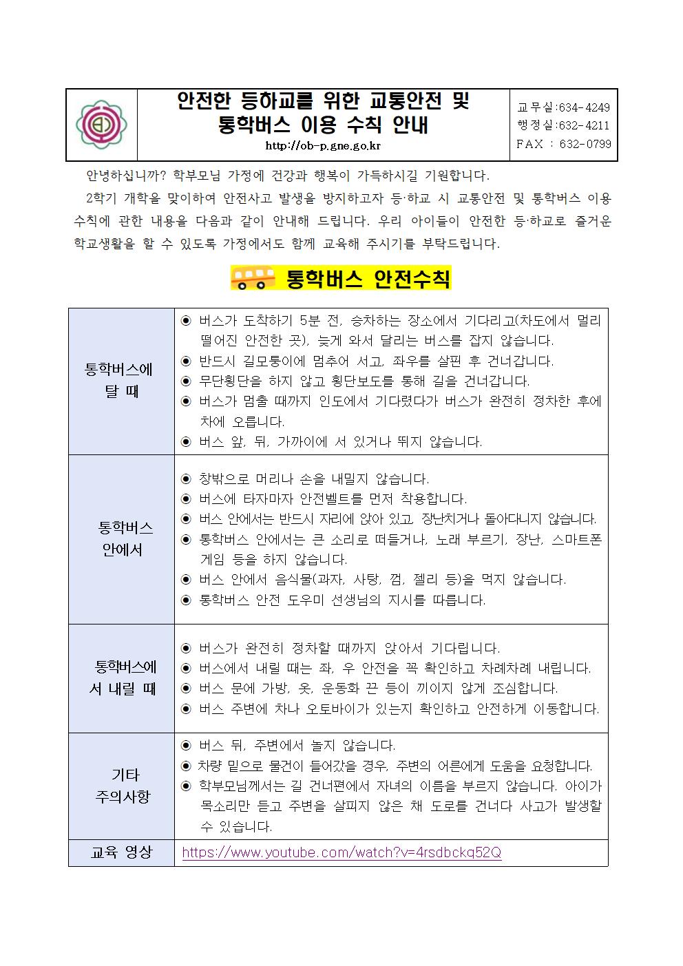 안전한 등하교를 위한 교통안전 및 통학버스 이용 수칙 안내